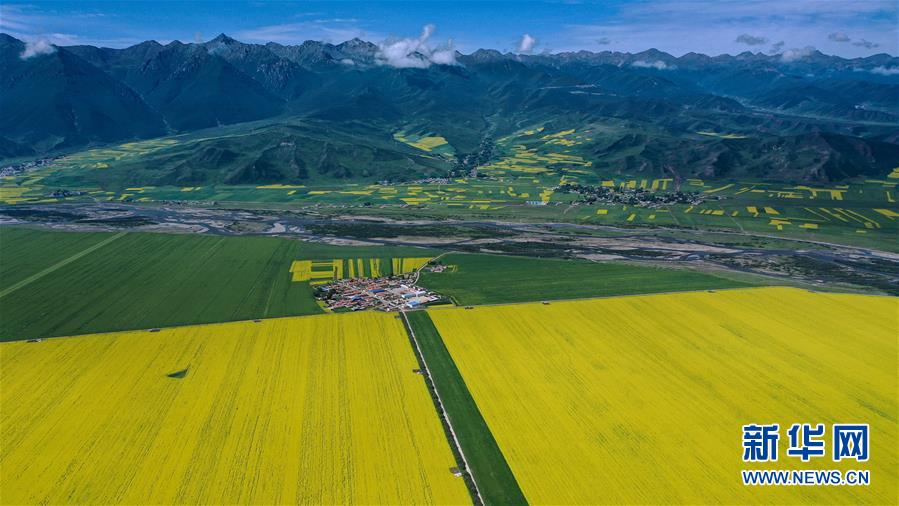 这是7月22日拍摄的门源回族自治县的油菜花田(无人机照片)。时下正值高原油菜花竞相绽放的季节,在青海省海北藏族自治州门源回族自治县,金黄色的油菜花在高原蓝天和云雾映衬下形成一幅壮丽画卷,吸引游客前来观赏。新华社记者 吴刚 摄