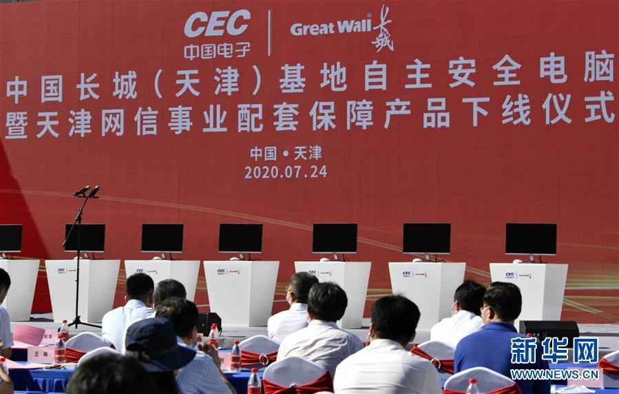 7月24日在中国长城(天津)基地拍摄的仪式现场。当日,中国长城(天津)基地自主安全电脑暨天津网信事业配套保障产品下线仪式在天津滨海高新区举行。据了解,中国长城(天津)基地网信事业配套保障体系项目主要服务华北地区,生产国产化自主安全电脑,建设国产化自主安全数据中心。新华社记者李然摄
