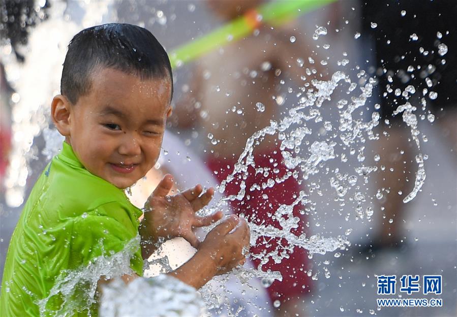 7月24日,一名小男孩在北京华熙LIVE·五棵松商业街区的一处喷泉戏水。北京市气象局7月24日傍晚发布称,24日截至16时30分,平原大部分地区出现37℃以上高温天气,局地气温超过40℃。北京市已于23日发布高温蓝色预警,预计25日全市大部分地区日最高气温仍将达35℃以上。新华社记者陈晔华摄