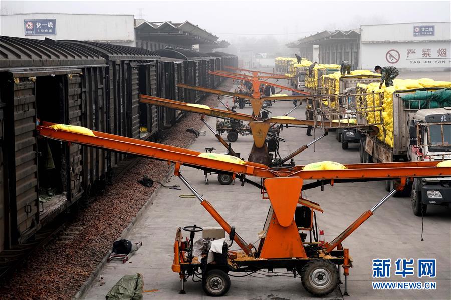 在中国铁路郑州局集团有限公司开封车站,工作人员使用传输机装运春耕物资(2月13日摄)。新华社记者 李安 摄