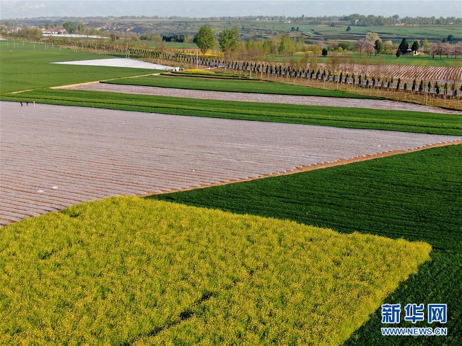这是洛阳市洛宁县小界乡一处油菜、西瓜、小麦间种的农田(4月13日摄,无人机照片)。新华社记者 李安 摄