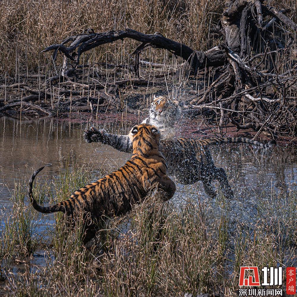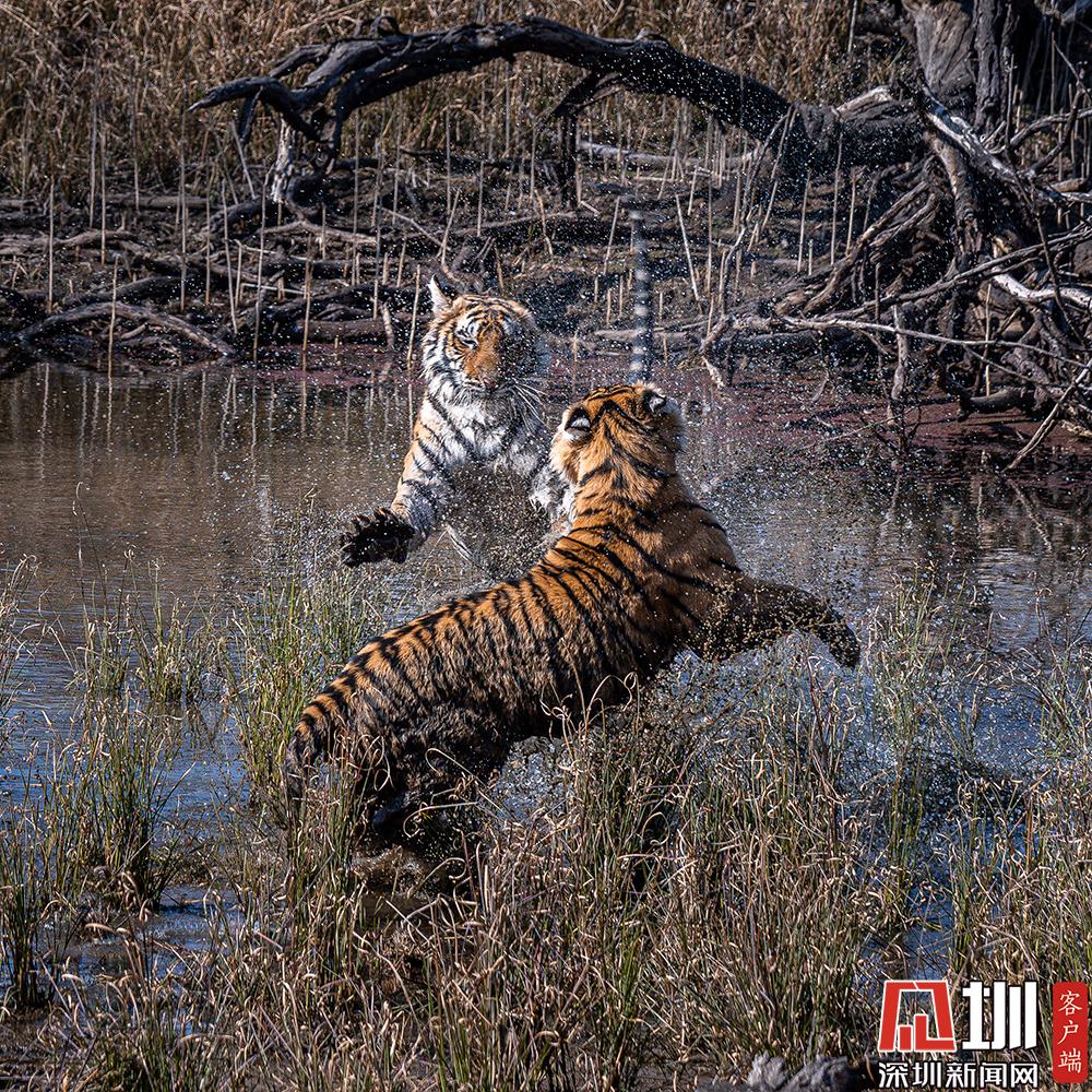 2020年7月27日,两只老虎幼崽激烈的水上争夺战。