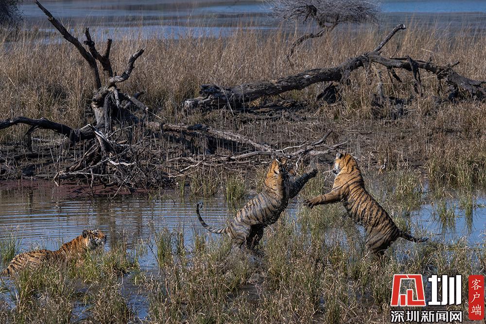 2020年7月27日,猛虎斗有多壮观?来自印度德里的41岁职业业摄影师Nitish Madan,在在印度北部伦滕波尔国家公园游览时,见证了两只老虎幼崽激烈的水上争夺战。从画面中可以看到,两只足足有200磅重的孟加拉虎,面对面互相咆哮,伸出虎爪凶猛至极,才15个月大就已经有了王者风范。