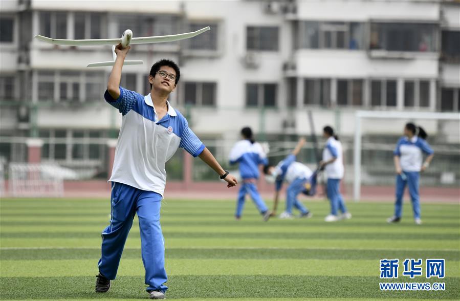 7月27日,参加暑期实践营的学生在天津中学操场上体验航模。新华社记者 李然 摄