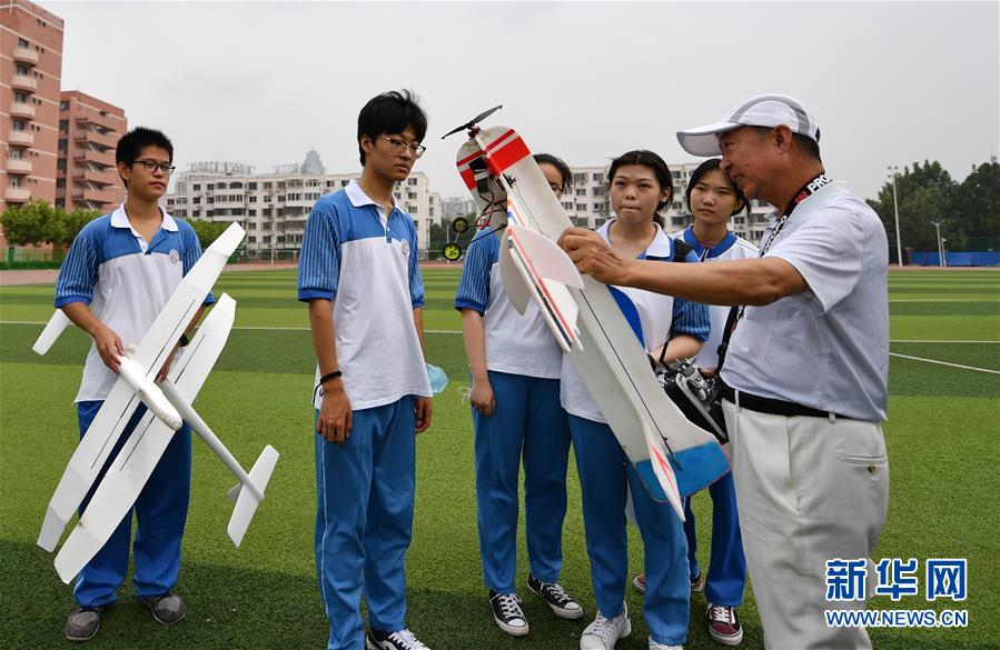 7月27日,老师在天津中学操场上给参加暑期实践营的学生讲解航模知识。新华社记者 李然 摄