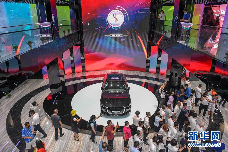7月28日,参观者参观红旗创新大厦内展出的红旗H9轿车。