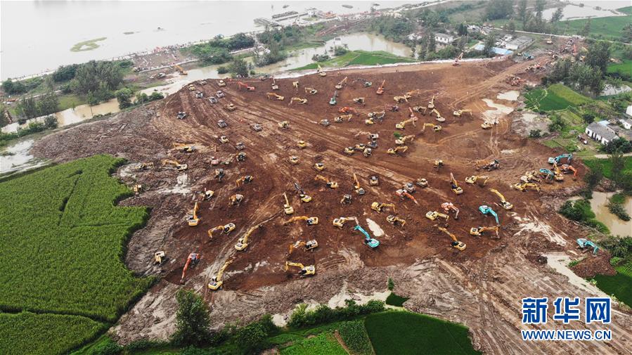 7月28日,在姜唐湖蓄洪区戴家湖一处涵闸险情处置现场,人们操作机械设备在抢筑临时圩堤(无人机照片)。新华社记者黄博涵摄
