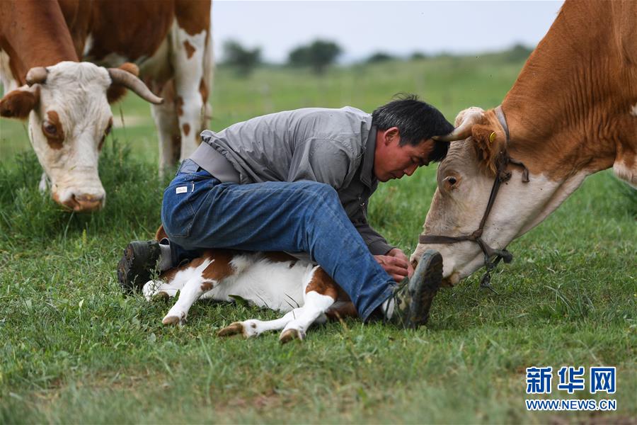 呼格吉勒在为牛犊处理伤口(7月26日摄)。新华社记者刘磊摄