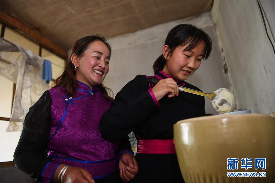 呼格吉勒的妻子萨如拉(左)在土坯房里教女儿苏日娜制作奶食品(7月23日摄)。新华社记者刘磊摄