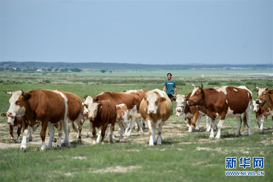 呼格吉勒在牧场放牛(7月23日摄)。新华社记者刘磊摄