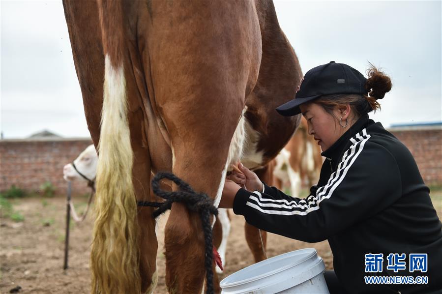 呼格吉勒的妻子萨如拉在挤奶(7月26日摄)。新华社记者刘磊摄