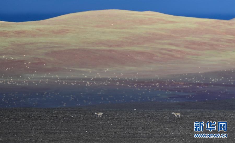 这是7月7日在可可西里卓乃湖区域拍摄的两只藏羚羊,后面的山坡上有大群觅食的藏羚羊。新华社记者张龙摄