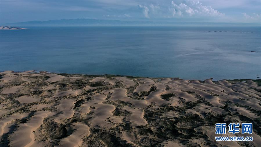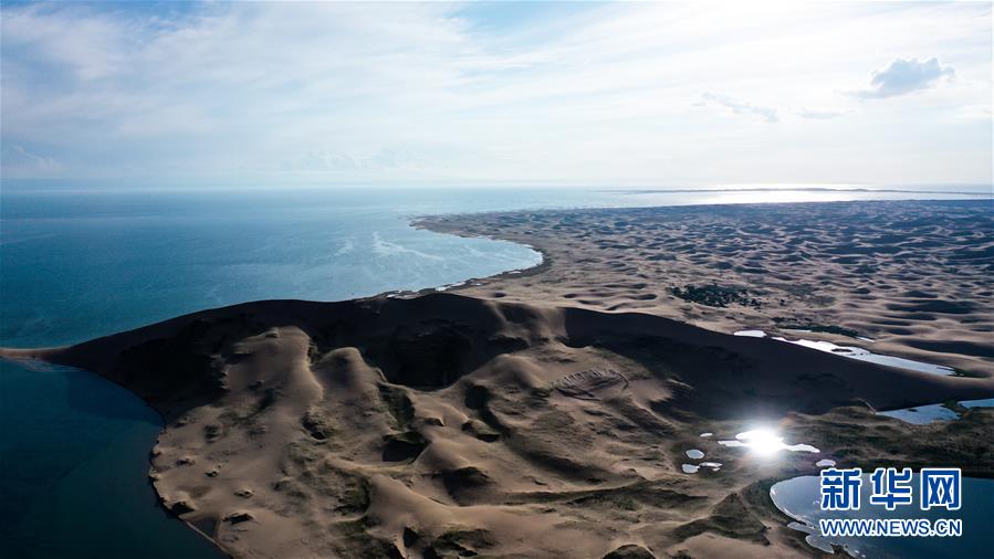 这是青海湖沙岛一角(7月28日摄,无人机照片)。盛夏傍晚,位于青海湖东北部的沙岛,岛内湖泊星罗棋布,沙丘连绵起伏,风景别致。金沙与湖水掩映,在阳光的勾勒下形成一幅美丽的画卷。新华社记者张宏祥摄