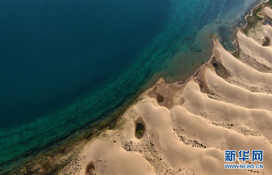 这是7月28日拍摄的青海湖沙岛一隅(无人机照片)。盛夏傍晚,位于青海湖东北部的沙岛,岛内湖泊星罗棋布,沙丘连绵起伏,风景别致。金沙与湖水掩映,在阳光的勾勒下形成一幅美丽的画卷。新华社记者吴刚摄