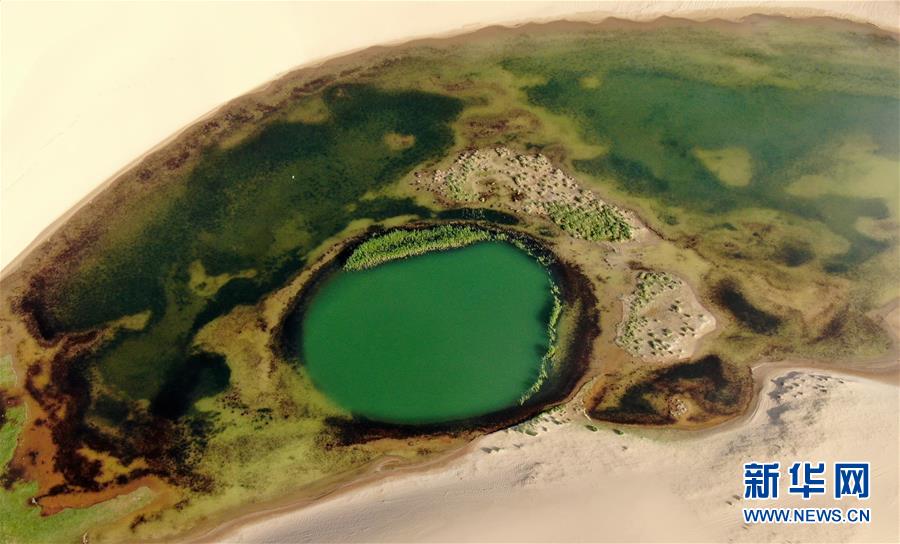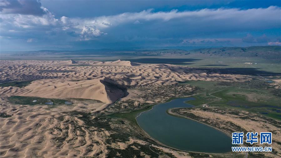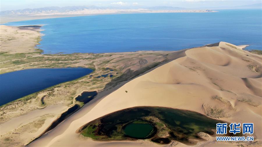 这是青海湖沙岛风光(7月28日摄,无人机照片)。盛夏傍晚,位于青海湖东北部的沙岛,岛内湖泊星罗棋布,沙丘连绵起伏,风景别致。金沙与湖水掩映,在阳光的勾勒下形成一幅美丽的画卷。新华社记者张宏祥摄