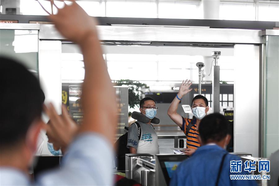 7月29日,在杭州萧山国际机场,电力工程技术人员走入安检通道后与送行人员挥手告别。当日,中国能源建设集团浙江火电建设有限公司的113名电力工程技术人员在杭州萧山国际机场集结,启程飞赴印度尼西亚首都雅加达。他们将重新投入到印尼多个“一带一路”重点工程的建设中。新华社记者黄宗治摄