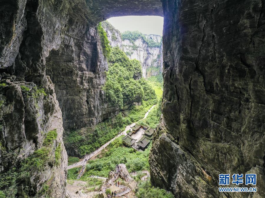 7月29日,游客在天生三桥景区内的天龙桥景点游览(无人机照片)。新华社记者刘潺摄