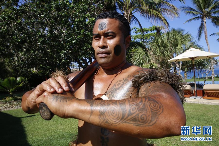 7月21日,在斐济首都苏瓦附近的纳努库奥博格海边度假村,一名斐济“武士”迎接游客。
