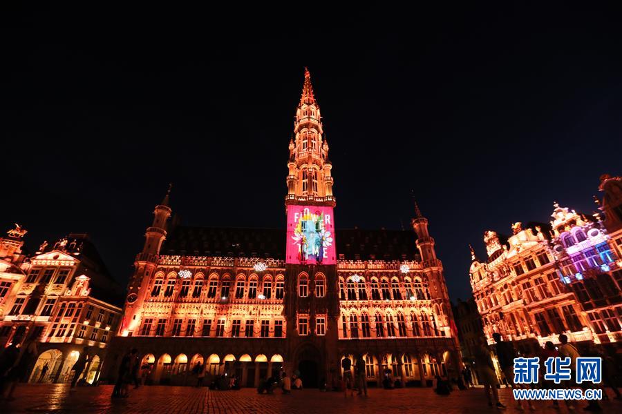 7月29日,人们在比利时布鲁塞尔大广场欣赏声光秀,市政厅外墙上投射出鲜花地毯主题的图案。7月29日,比利时布鲁塞尔大广场举行大型声光秀。艺术家在市政厅等历史建筑上投影文字和图案,纪念这个夏天受新冠疫情影响而不能如期举办的文化活动。新华社记者郑焕松摄
