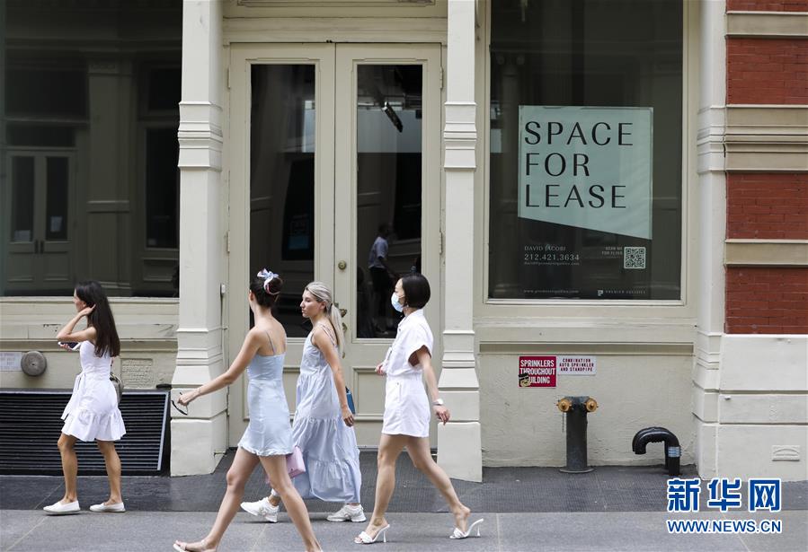 7月30日,在美国纽约苏豪商业区,人们从一家招租的店面旁走过。美国商务部30日公布的首次预估数据显示,受新冠疫情导致经济大面积“停摆”和消费停滞拖累,今年第二季度美国实际国内生产总值(GDP)按年率计算下滑32.9%,创1947年有记录以来最大降幅。新华社记者王迎摄