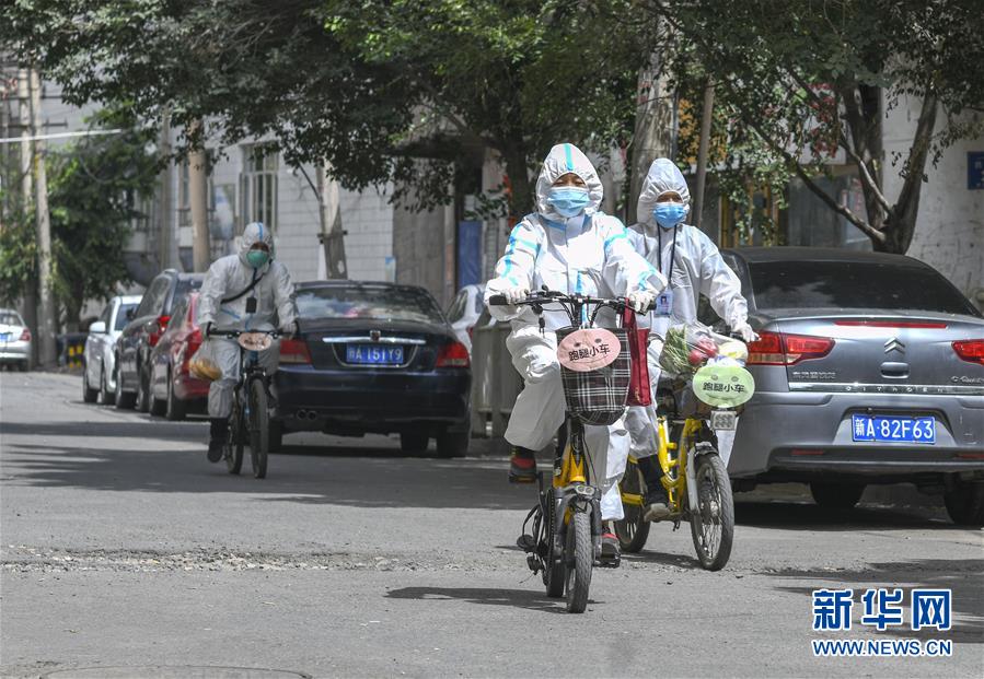 8月3日,在乌鲁木齐天山区西河坝前街社区,社区工作人员骑着”跑腿小车“为居民送去生活物品。新疆乌鲁木齐市天山区西河坝前街社区主次干道较多,院落分布分散。新冠肺炎疫情防控期间,社区整合现有资源,将暂时闲置的自行车、电动车集中起来,贴上“跑腿小车”标识,成立便民服务队,社区工作人员通过“跑腿小车”可将居民网络定制的“菜袋子”“药盒子”快速送达,给居民带来方便。新华社记者赵戈摄