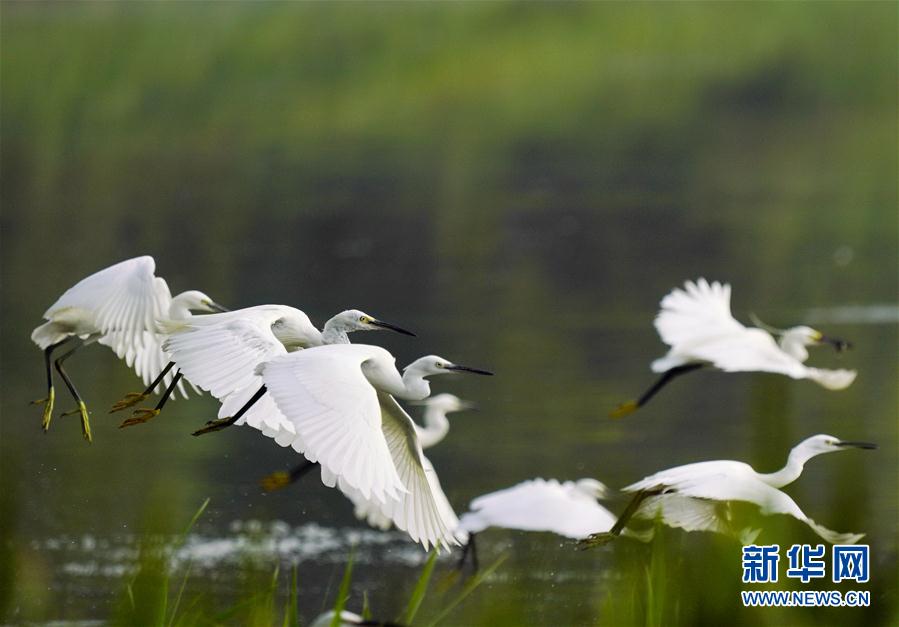 8月3日,白鹭在唐山南湖公园飞舞。近日,大批鹭鸟飞抵河北唐山南湖公园,在此觅食、嬉戏。唐山南湖公园所在地曾是因采煤沉降形成的废弃地,经综合治理,成为一座水域面积11.5平方公里、绿地面积16平方公里的生态公园。新华社记者杨世尧摄
