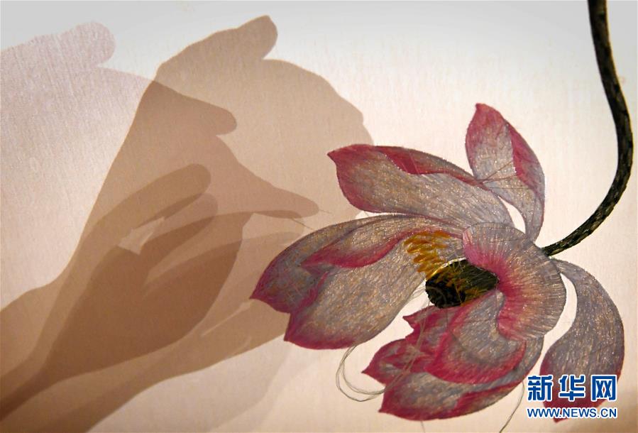 在开封市素花宋绣工艺有限公司的展示馆里,王素花的徒弟刘冬红在刺绣(7月30日摄)。新华社记者李嘉南摄