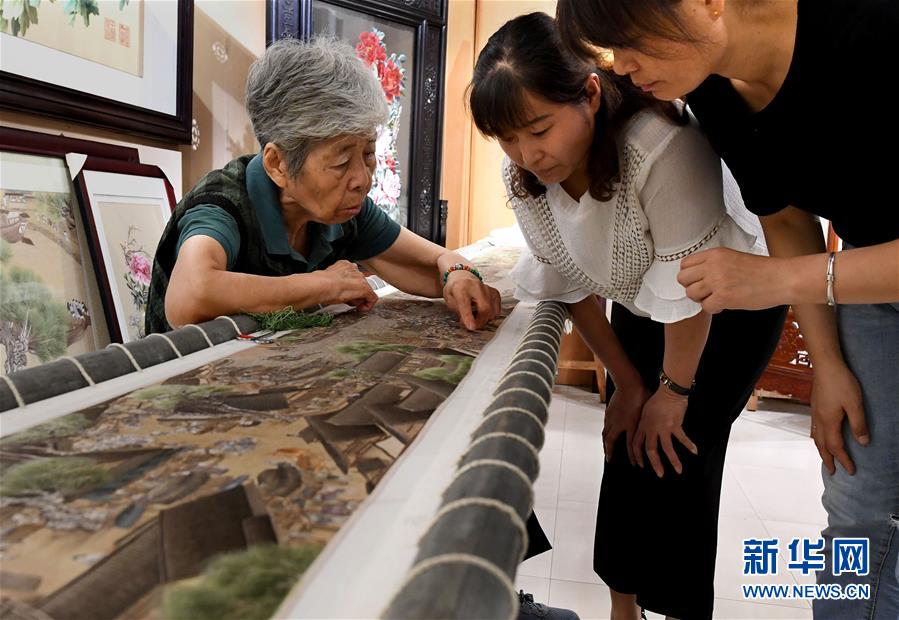 在开封市素花宋绣工艺有限公司的展示馆里,王素花指出徒弟们绣品上需要修改的地方(7月30日摄)。新华社记者李安摄