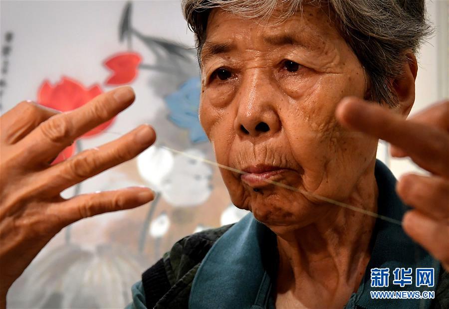 在开封市素花宋绣工艺有限公司的展示馆里,王素花在劈线(7月30日摄)。新华社记者李安摄