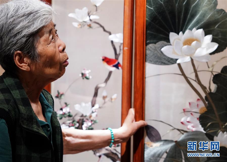 在开封市素花宋绣工艺有限公司的展示馆里,王素花在观看自己的刺绣作品(7月30日摄)。新华社记者李嘉南摄