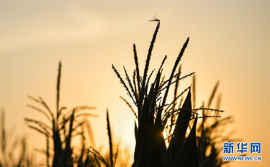 在吉林省梨树县国家百万亩绿色食品原料(玉米)标准化生产基地核心示范区,一只蜻蜓停靠在一株玉米上(7月23日摄)。新华社记者许畅摄