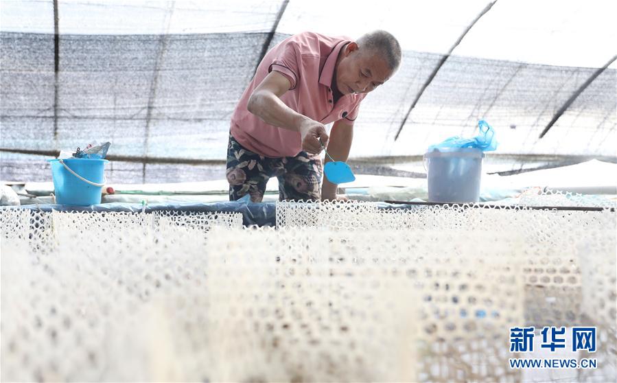 8月4日,张忠堡村村民赵世龙在观察育种筐里的观赏鱼排卵状况。新华社记者姚剑锋摄