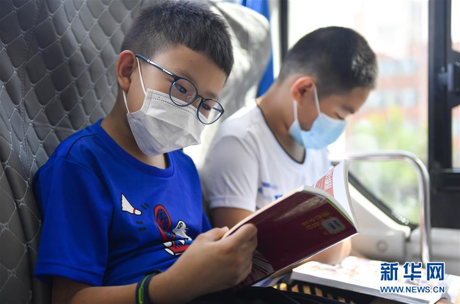 8月5日,小读者在“流动图书馆”里看书。三千册图书,一辆大巴车,穿梭在城市的街头巷尾。在吉林长春,长春市图书馆利用流动图书车,定期在市内15个固定服务点间巡回流动,为市民提供便捷的图书借阅服务。新华社记者许畅摄