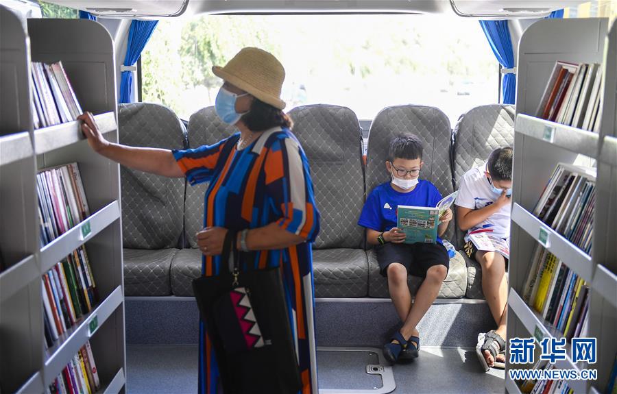 8月5日,长春市民在“流动图书馆”里看书。三千册图书,一辆大巴车,穿梭在城市的街头巷尾。在吉林长春,长春市图书馆利用流动图书车,定期在市内15个固定服务点间巡回流动,为市民提供便捷的图书借阅服务。新华社记者许畅摄