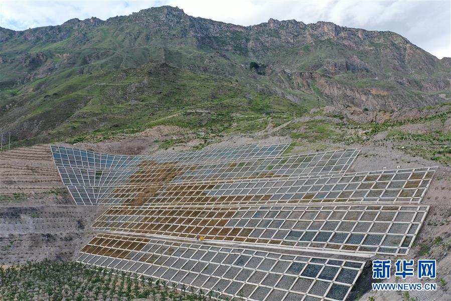 这是7月15日拍摄的舟曲县南峪乡江顶崖山体滑坡治理点(无人机照片)。新华社记者杜哲宇摄