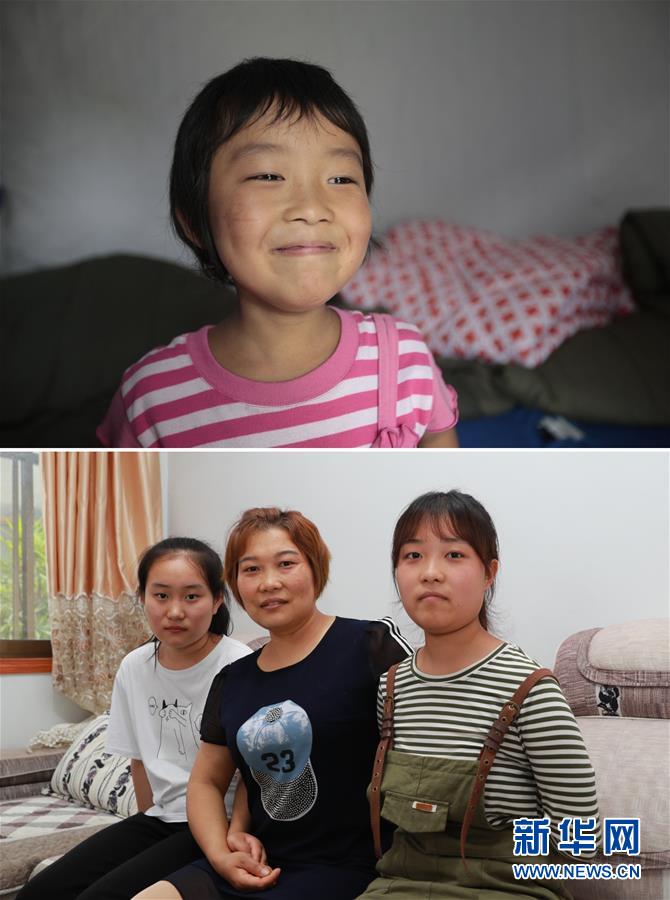 拼版照片:上图为2010年8月20日,盼望开学的小雪梅在受灾群众安置点的帐篷内(新华社记者任正来摄);下图为2020年7月14日,雪梅(右)和母亲、妹妹在一起(新华社记者杜哲宇摄)。新华社发