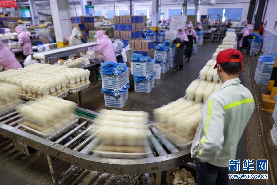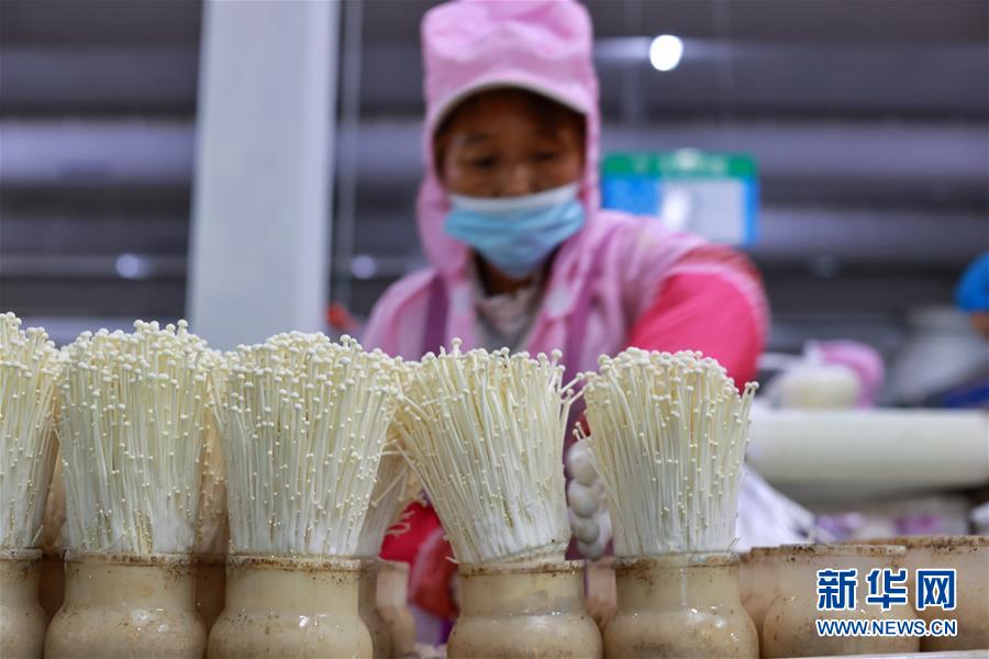 8月6日,工作人员在威宁雪榕生物科技有限公司包装金针菇。新华社记者刘续摄