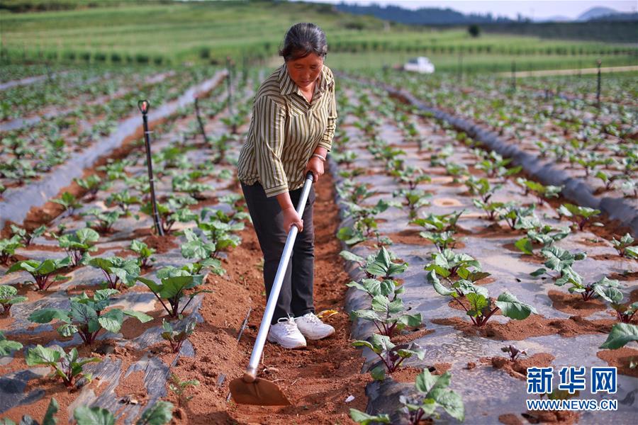 8月6日,村民在威宁县草海镇中海社区蔬菜基地种植红菜苔。新华社记者刘续摄
