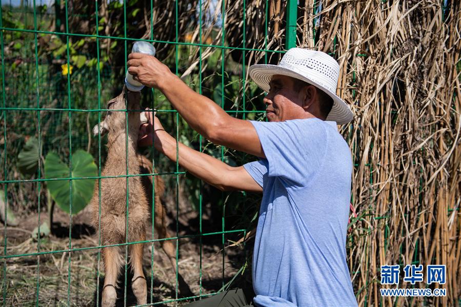 8月7日,在东洞庭湖麋鹿和鸟类救治避难中心,饲养员李卫东给被救助的麋鹿喂奶。位于湖南省岳阳市的东洞庭湖麋鹿和鸟类救治避难中心成立于2016年9月,占地400余亩,中心自建成后就承担起东洞庭湖区域全部麋鹿的救援、医治、康复和喂养任务。目前该中心共有14只麋鹿正在接受救助。新华社记者陈思汗摄