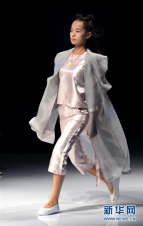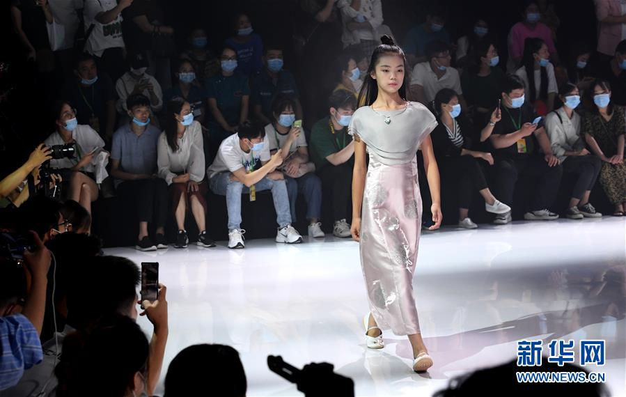 8月7日,小模特在T台上展示童装。当日,2020中国(河南)国际大学生时装周举行童装设计专场展示。8月5日至7日,2020中国(河南)国际大学生时装周在河南省新密市豫发密兰小镇举行。新华社记者朱祥摄