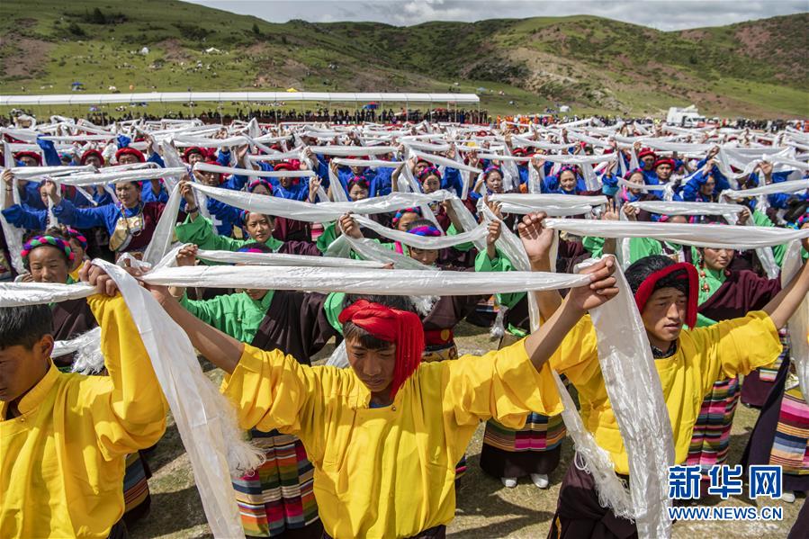 8月7日,在西藏首届弦子舞展演现场,演出人员在表演弦子舞。当日,西藏首届弦子舞展演在昌都市芒康县举行。众多演员同台献艺,表演国家级非物质文化遗产弦子舞,吸引西藏各地的群众前来观看。新华社记者孙非摄