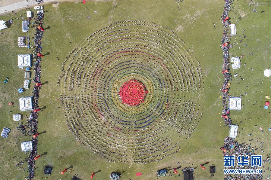 西藏首届弦子舞展演现场(8月7日摄,无人机照片)。当日,西藏首届弦子舞展演在昌都市芒康县举行。众多演员同台献艺,表演国家级非物质文化遗产弦子舞,吸引西藏各地的群众前来观看。新华社记者孙非摄