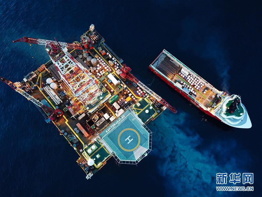 这是7月29日拍摄的正在南海北部海域进行钻探作业的勘探三号钻井平台和为其运送物资的拖船(无人机照片)。新华社记者蒲晓旭摄