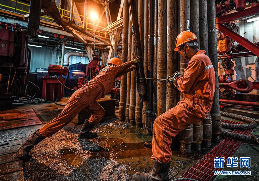 7月26日,在位于南海北部海域的勘探三号钻井平台上,钻井工人在摆放钻杆。新华社记者蒲晓旭摄