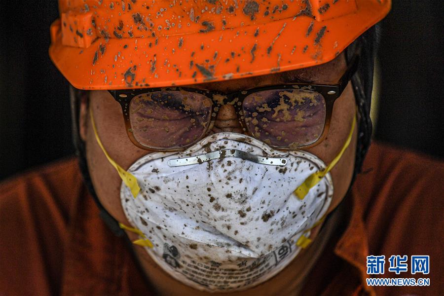7月27日,在位于南海北部海域的勘探三号钻井平台上,一名钻井工人在作业时眼镜和口罩沾满了泥浆。新华社记者蒲晓旭摄
