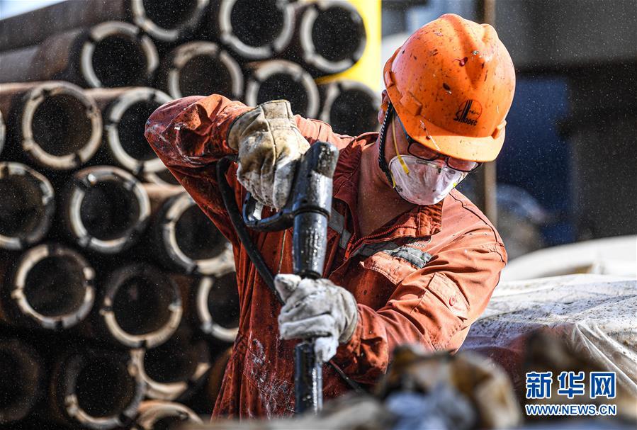 7月27日,一名工人在位于南海北部海域的勘探三号钻井平台上作业。新华社记者蒲晓旭摄