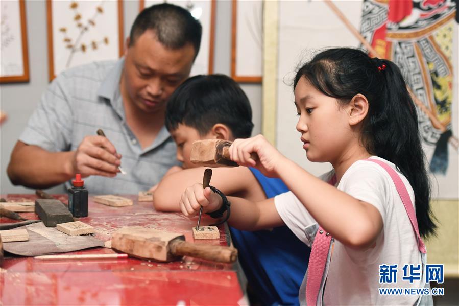 8月8日,小朋友在长沙市非物质文化遗产展示馆体验望城新康木雕技艺。新华社记者 薛宇舸 摄