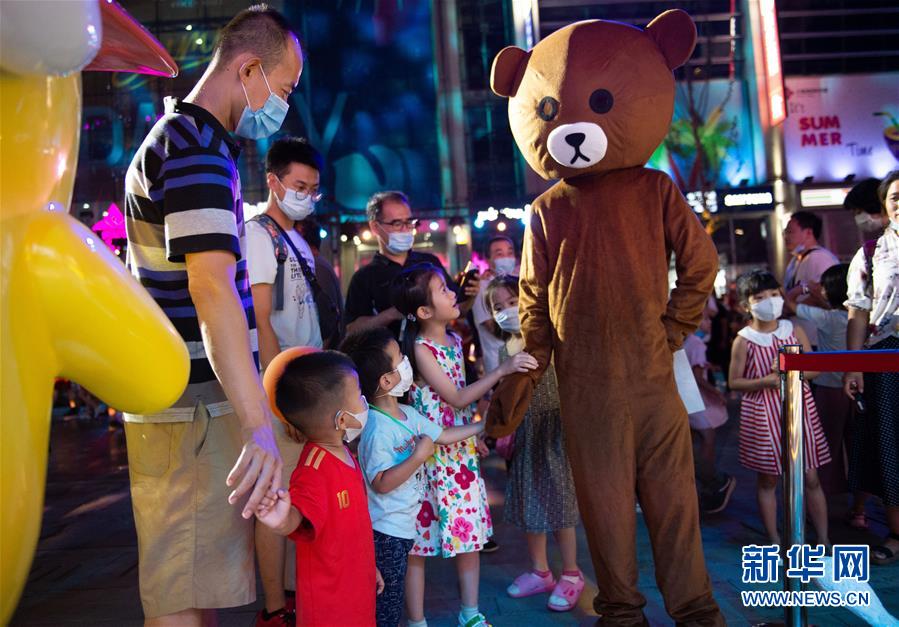 8月8日晚,小朋友在望京小街商业街与人偶互动。新华社记者 陈钟昊 摄