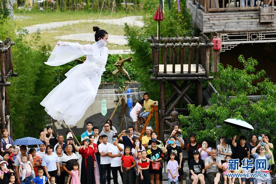 8月8日,游客在贵州省龙里县“龙门镇”武侠文化主题景区观看武侠剧表演。近日,贵州省黔南布依族苗族自治州龙里县境内气候宜人,龙里油画大草原、“龙门镇”武侠文化主题景区等景点吸引众多游客前来观光旅游。新华社记者杨文斌摄。