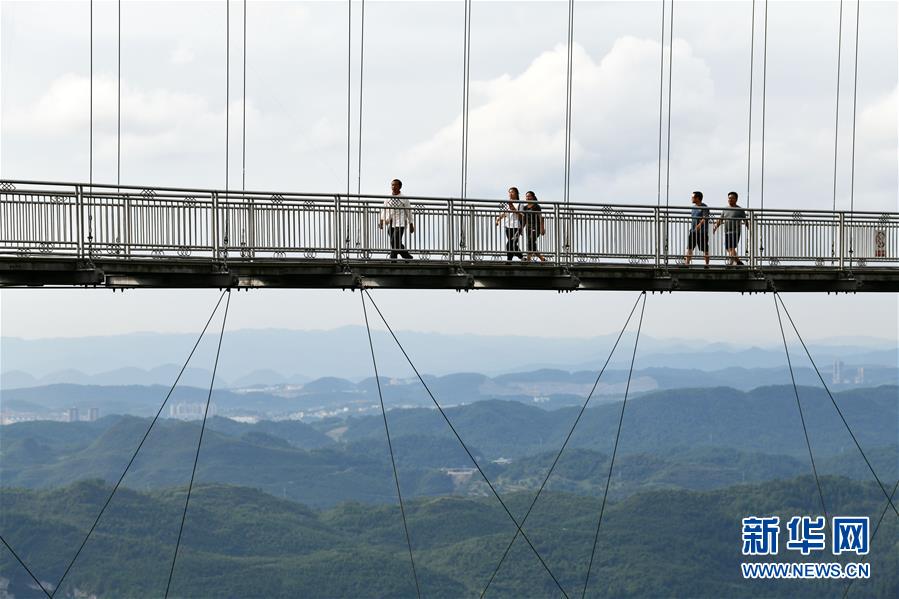 8月8日,游客在贵州省龙里油画大草原的吊桥上观光。近日,贵州省黔南布依族苗族自治州龙里县境内气候宜人,龙里油画大草原、“龙门镇”武侠文化主题景区等景点吸引众多游客前来观光旅游。新华社记者杨文斌摄。